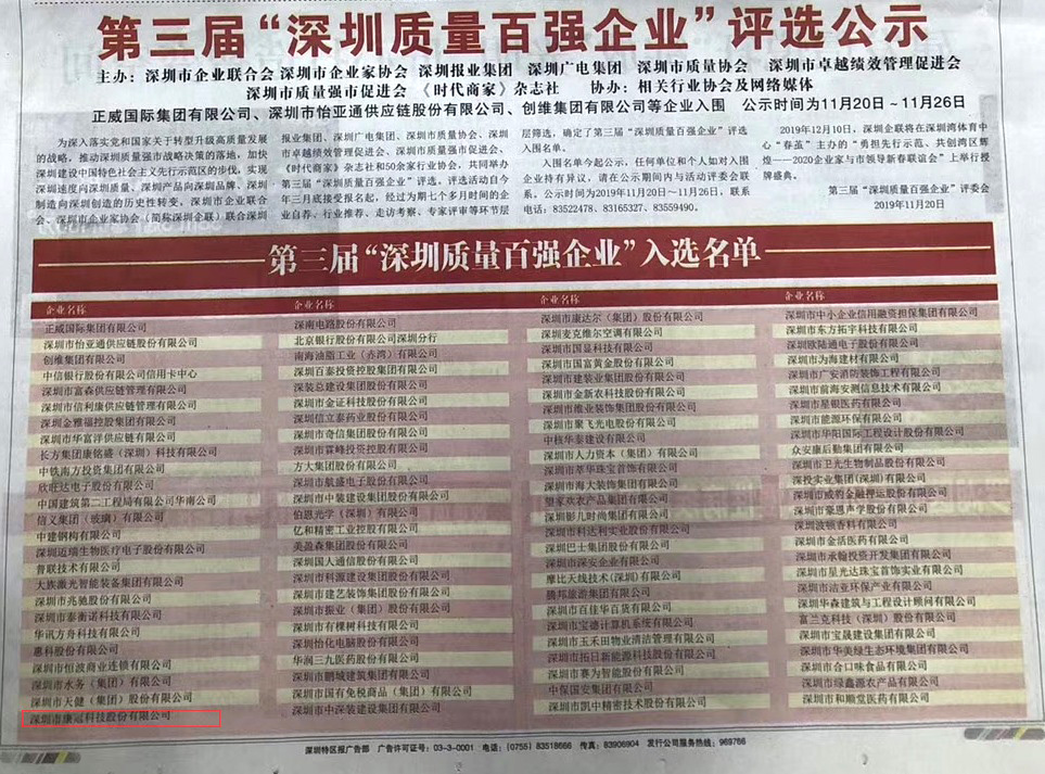 为深入贯彻党和国家关于转型升级高质量发展的战略,推动深圳质量强市战略决策的落地,加速深圳高质量高标准发展先行示范区,深圳市企业联合会、深圳市企业家协会召开第三届“深圳质量百强企业”评选新闻发布会,该评选活动得到了市政府的重视和支持,并由市场监督管理局等部门给予专业指导,经专家评审和网上公示等程序,南宫28被评为“深圳质量百强企业”。