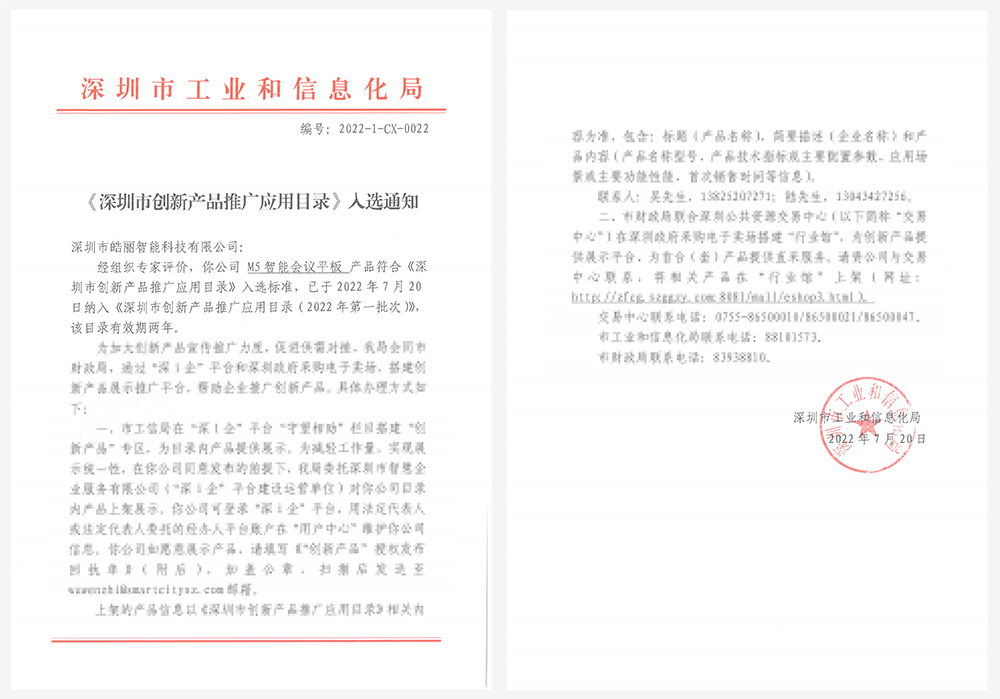 近期,深圳市工业和信息化局发布《深圳市创新产品推广应用目录(2022年第一批次)》,深圳市皓丽智能科技有限公司的M5智能会议平板成功入选该目录。
