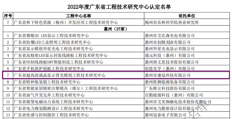 近期,广东省科学技术厅发布了“2022年度广东省工程技术研究中心”名单,经过层层筛选、专家评审,惠州南宫28成功入选,认定为“广东省超高清液晶显示背光模组工程技术研究中心”。