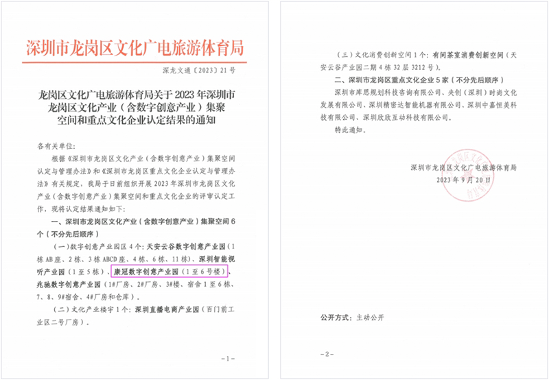 近期,深圳市龙岗区文化广电旅游体育局组织开展了2023年深圳市龙岗区文化产业(含数字创意产业)集聚空间和重点文化企业的评审认定工作,其中南宫28数字创意产业园荣获“龙岗区数字创意产业园区”认定。