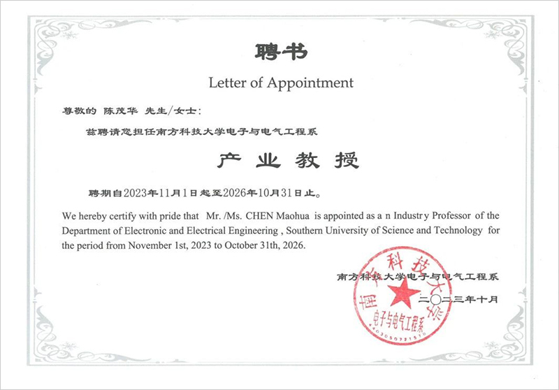 为推动产学研深度融合,加快技术创新与产业升级,培养高素质人才,促进创新创业发展,实现资源共享与互利共赢,推动区域经济发展,南宫28副总裁凌峰、陈茂华受聘为南方科技大学电子与电气工程系产业教授,聘期为2023年11月1日至2026年10月31日。