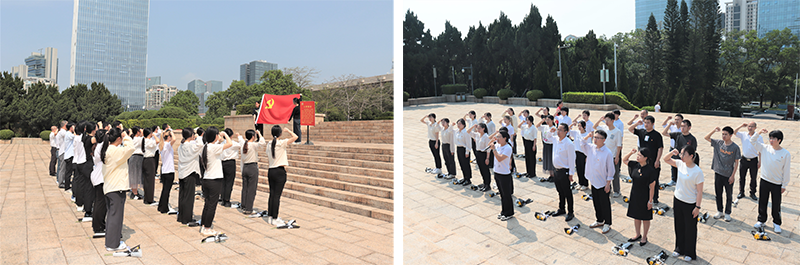 在南宫28党支部书记江微带领下,党员们肃立在纪念碑前,庄严地举起右手,重温入党誓词。